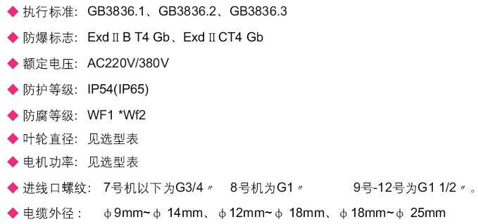 ● 通風機由防爆電動機、葉輪、風(fēng)筒、防護罩等組成;